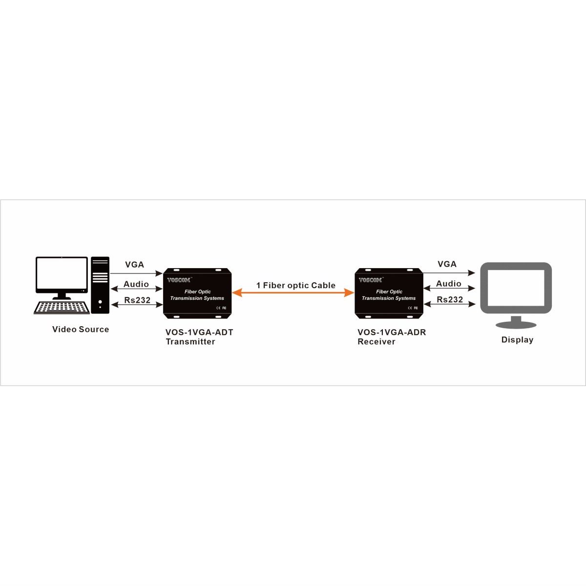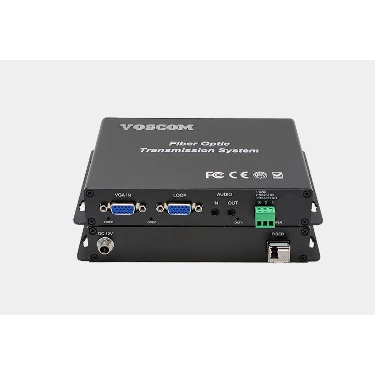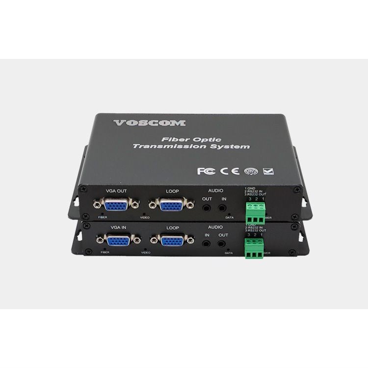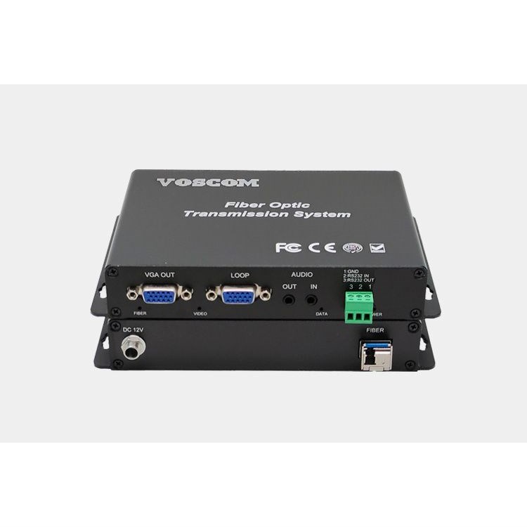 VOSCOM VGA over Fiber Extender, VOS-1VGA-ADT/R provides 1-Channel uncompressed VGA video, resolutions up to WUXGA 1920x1200 and HDTV RGB Component Video resolutions up to 1080p, support 1 duplex stereo audio and 1 duplex Rs232 data, also support one VGA loopback output for local display and dual VGA outputs for two displays in the remote end.Stand-alone or rack-mount. All VGA extenders over Fiber of VOS-1VGA-ADT/R comes in an insert card version. The cards can be inserted into our 16-slot, 19inch 4U rack-mountable card cage (VOS-CH04).Single-Mode or Multi-Mode, VOS-1VGA-ADT/R only can support LC optical connector, support Single-mode 10km or Multi-mode 300m over one single-fiber.