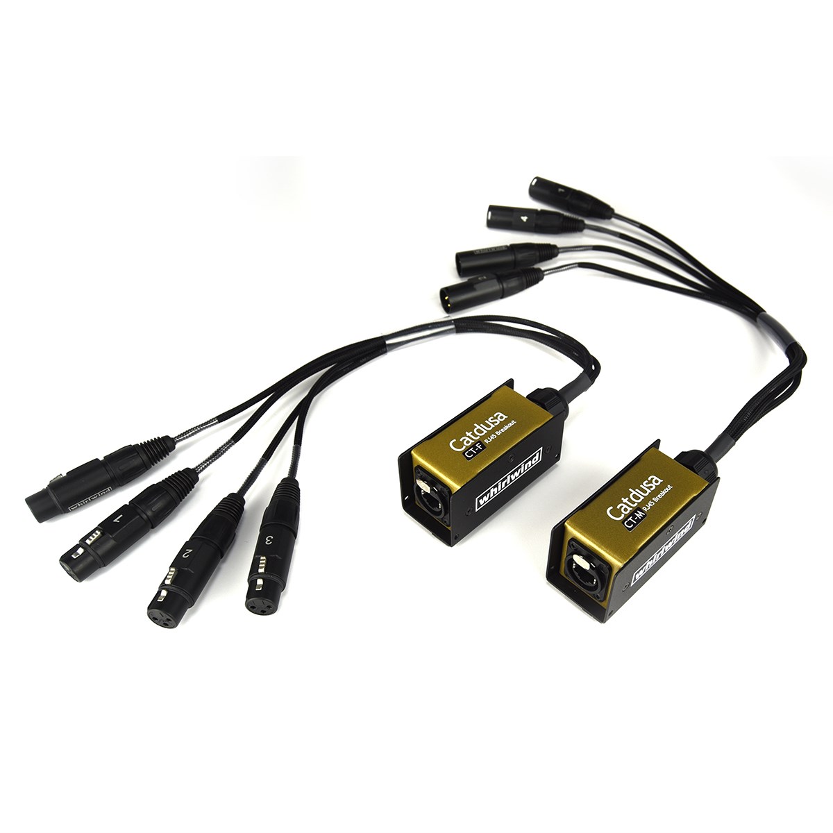 Catdusa CT-F and CT-M are recent additions to the Catdusa family. Like other Catdusa products, they use Cat cable to transmit four channels of analog audio. Both have a Neutrik Ethercon connector broken out to four XLRs on 18 inch tails. They are wired with 110 ohm cable to maintain AES and DMX performance when using shielded Cat cable. Using shielded Cat cable also allows phantom power to pass for condenser microphones. The CT-F has four female XLRs, while the CT-M terminates to four male XLRs, and the CT-MF has 4 interchangable (male/female) XLRs.. They can be used together to create a simple 4 channel fan to fan snake, or they can be combined with other Catdusa pieces to create a flexible and comprehensive stage sub snake system. Check out our entire Catdusa family, and find out what RJ45 solution works best for you!