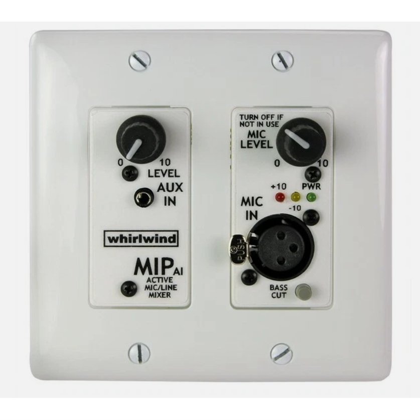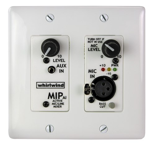 Up to three MIPAI plates can be daisy-chained together and powered from a single supply located in the equipment rack. Features include LED level indicators, a bass cut switch on the mic input for reducing rumble and a 3.5mm aux input jack that automatically sums stereo inputs to mono. Screw terminal connections are provided and wiring can be done with two pieces of Belden® 8451 type wire or a single Cat5 type wire. Electrical backbox depth of 2.5" minimum recommended for gangable box type, 2.125" for utility box type.