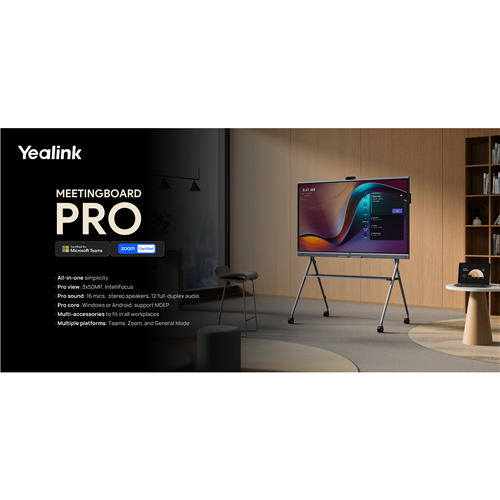 Yealink MeetingBoard Pro is the latest all-in-one meeting device with 3 sizes (65'', 75'', and 86'') designed for small to large rooms. This intelligent meeting device integrates video conferencing, HD wireless content sharing, and an electronic whiteboard, supporting up to 4K video call quality. Its all-in-one design and flexible mounting options offer easy installation and are perfect for seamless video conferencing. This product delivers cutting-edge audio and video communication capabilities, powered by advanced AI technology, ensuring crystal-clear sound and ultra-HD visuals. With intelligent full-duplex, IntelliFocus, and video fence, it redefines the video conferencing experience, bringing unparalleled clarity and efficiency to every meeting. The MeetingBoard Pro also supports native Teams and Zoom and is certified by both platforms.