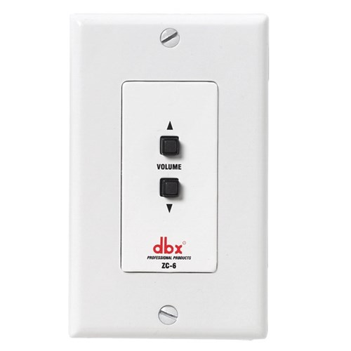The remote device shall provide computer programmable push-button up/down volume control for the dbx® ZonePRO™ devices. The remote device shall have DIP switches allowing identification with connection to the processing device via CAT 5 cable on RJ-45 connectors. The device shall be a dbx ZC-6 remote controller.